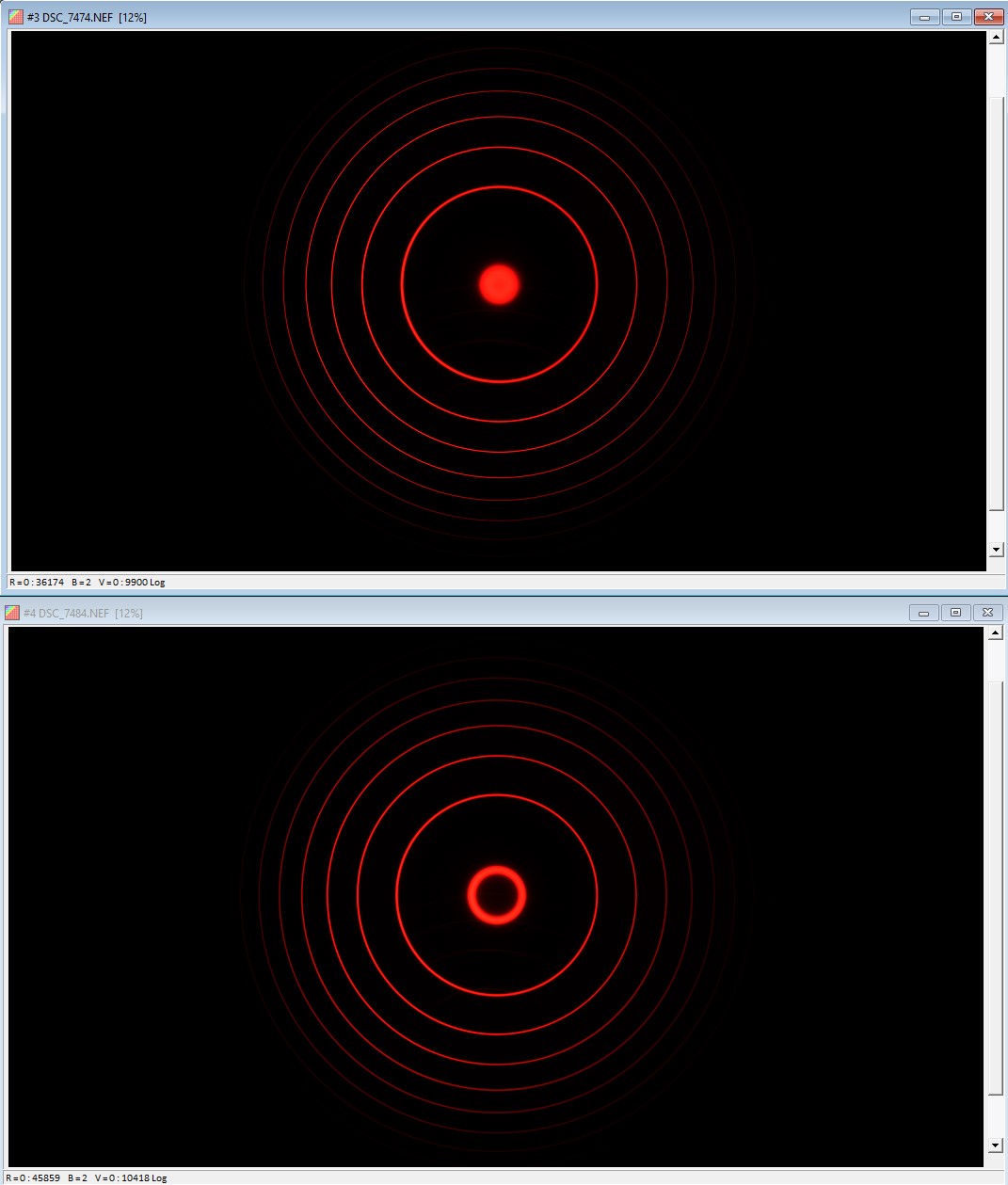 Interference fringes obtained at -0.1 A (top) and and +0.7 A (bottom).